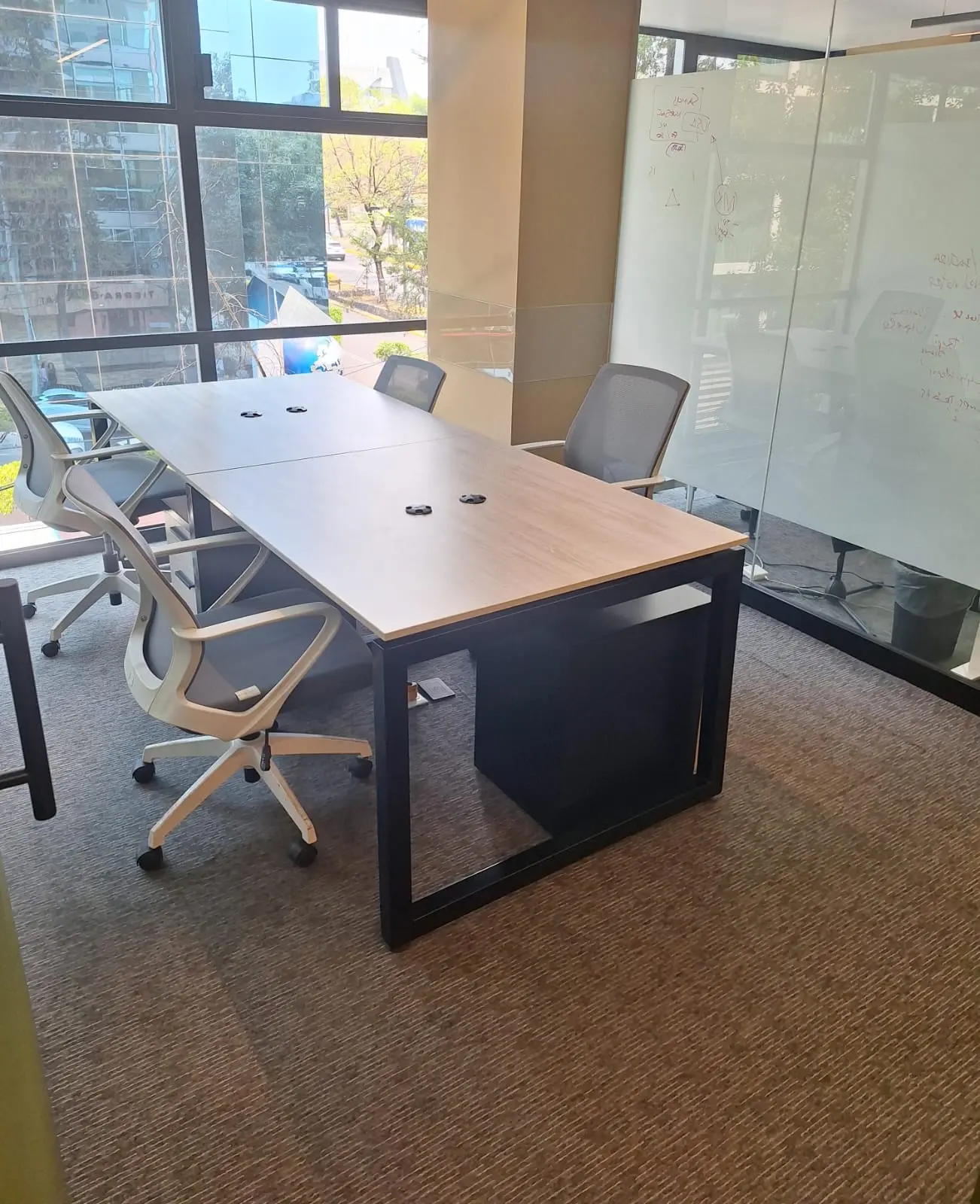 Espacios profesionales con pantallas para presentaciones y videoconferencias.